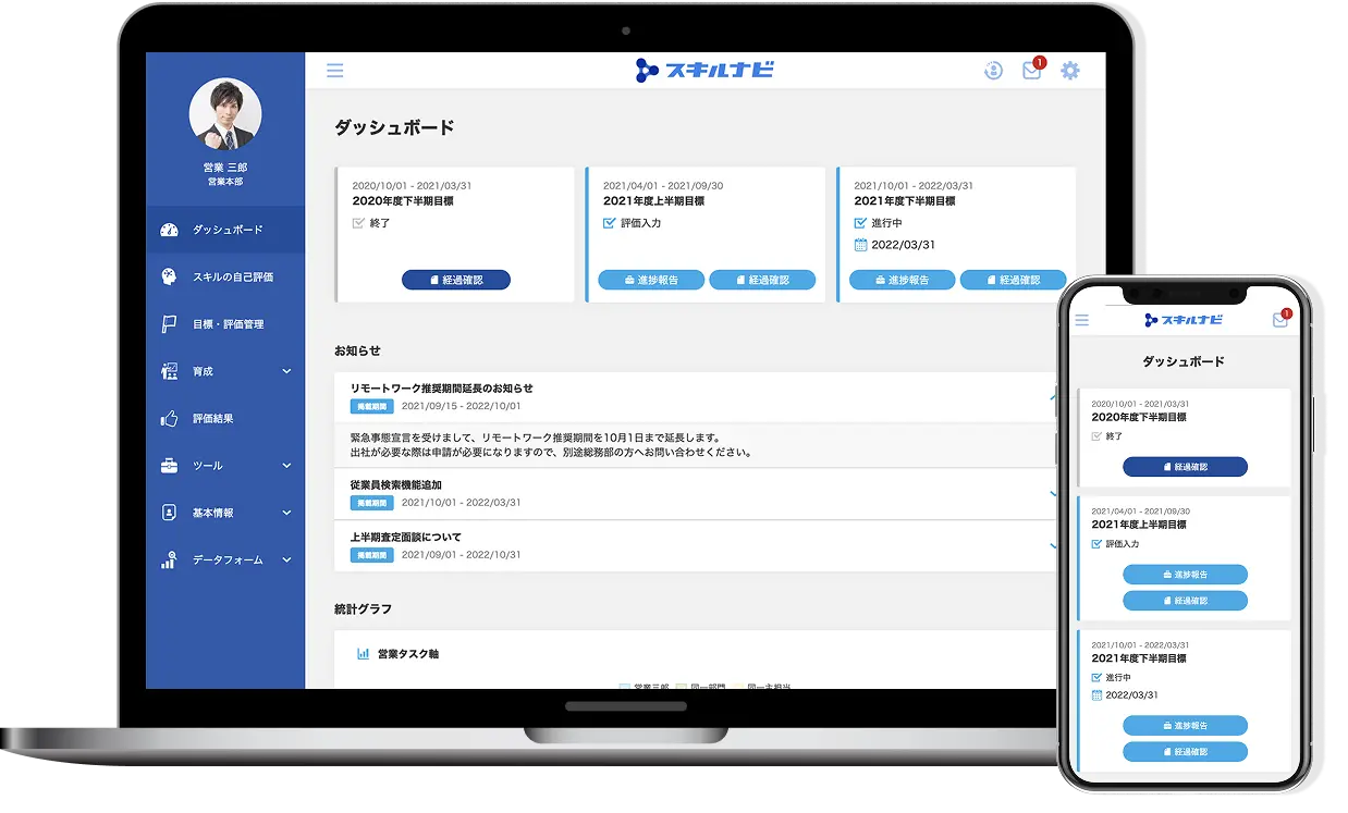 日報や報告書のデータを集計し、業務負荷の分析やスキル値に反映できる