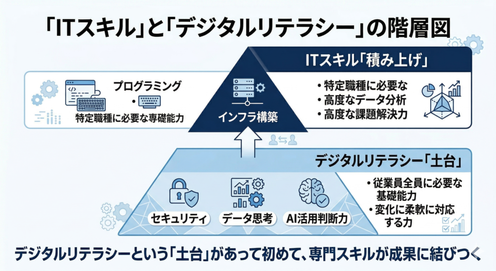 ITスキルは「特定の技術を実行できるか」というテクニカルな能力であるのに対し、デジタルリテラシーは「デジタル技術全般とどう向き合い、活用するか」という土台となる素養です。ITスキルはデジタルリテラシーの上に積み上がるものとして理解すると、研修設計の役割分担が明確になります。