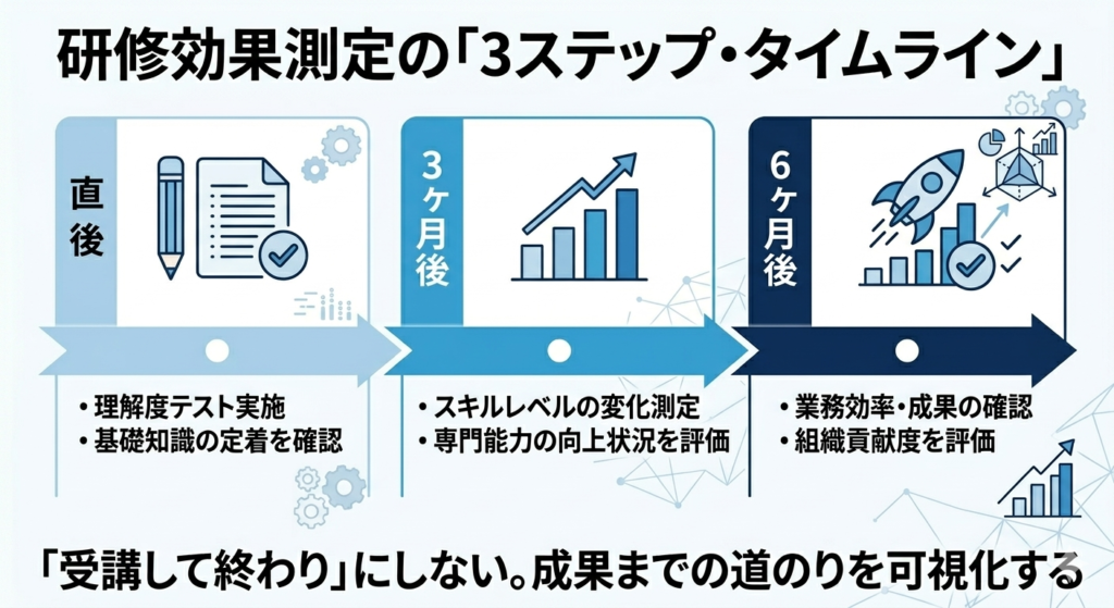 一つ目は「理解度テスト(研修直後)」です。研修終了後に実施する確認テストで、知識の定着状況を測定します。ただしこれは「知っている」かどうかの確認にすぎず、業務への活用可否は測れません。