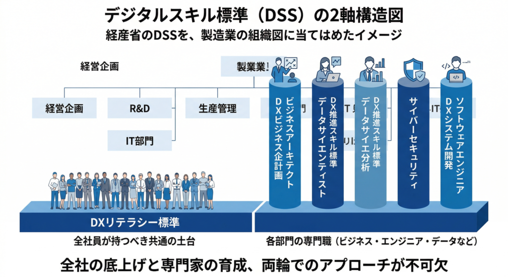 DSSは「DXリテラシー標準」と「DX推進スキル標準」の2軸で構成されています。DXリテラシー標準は全社員に求める基礎的なデジタルリテラシーを定義したもの、DX推進スキル標準はDXを主導する専門職に求めるスキルを職種別に整理したものです。製造業でデジタルスキルマップを設計する際の出発点として、この2軸の構造を参照することで、設計の抜け漏れを防げます。