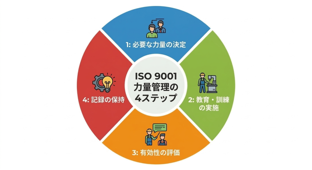 ISO 9001の力量管理を機能させるためには、「スキルの定義」「教育の計画・実施」「有効性の確認」「資格の管理」という4つの情報を一本の流れでつなげることが重要です。