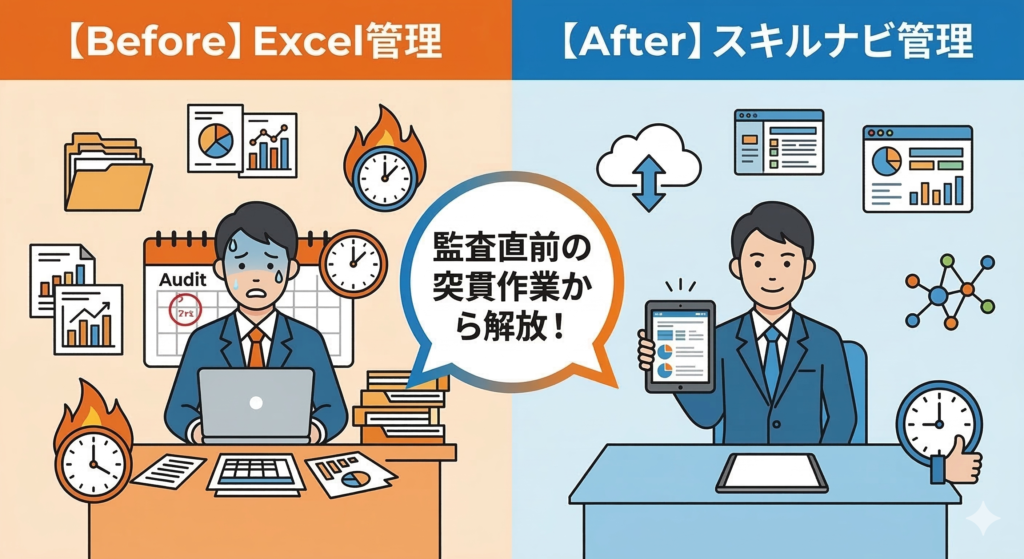 Excelによる管理では、日常的な更新が後回しになりがちです。その結果、審査の数週間前になって慌てて記録を整備する「監査直前の突貫作業」が常態化します。