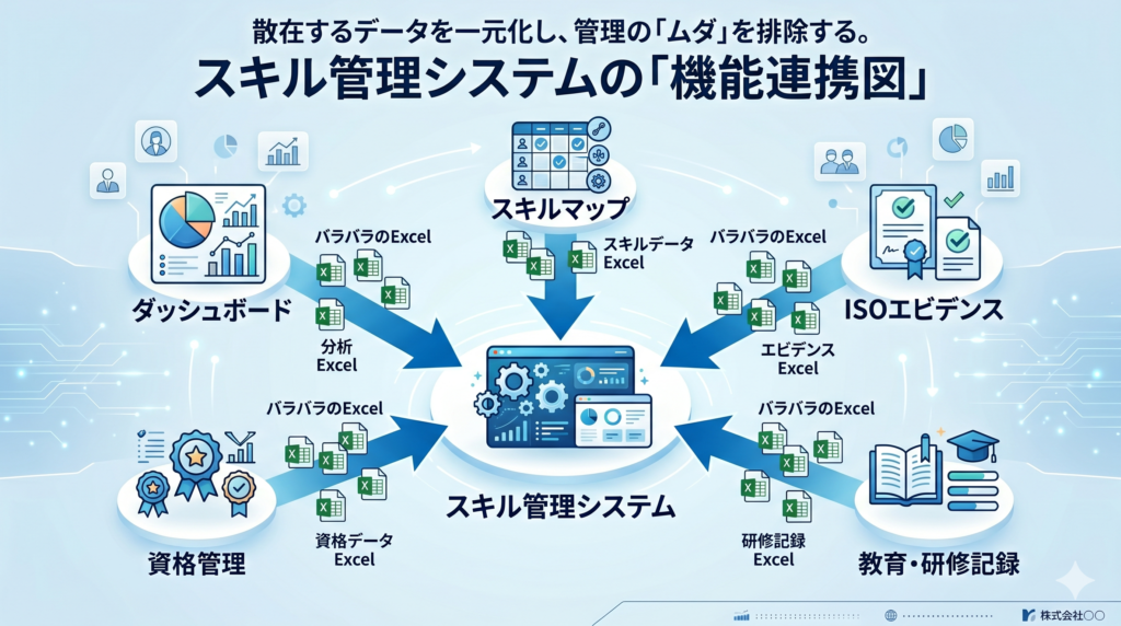 「Excelでスキルマップを管理しているが、更新が追いつかない」「ISO監査のたびに記録をかき集める作業が発生する」「誰がどの工程をどのレベルで担当できるか、すぐに答えられない」——こうした状況は、スキル管理をExcelに頼っている組織の大半が経験している問題です。