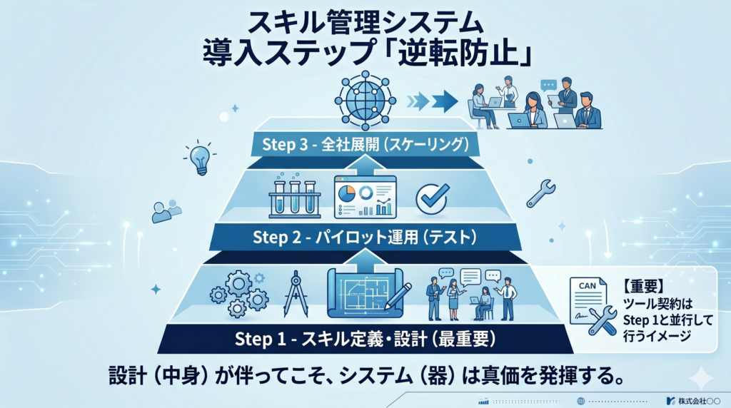 パイロット運用の結果をもとにスキル定義・評価基準・運用ルールを微調整してから全社展開に進むことで、「導入したが誰も使わなかった」という失敗を防げます。