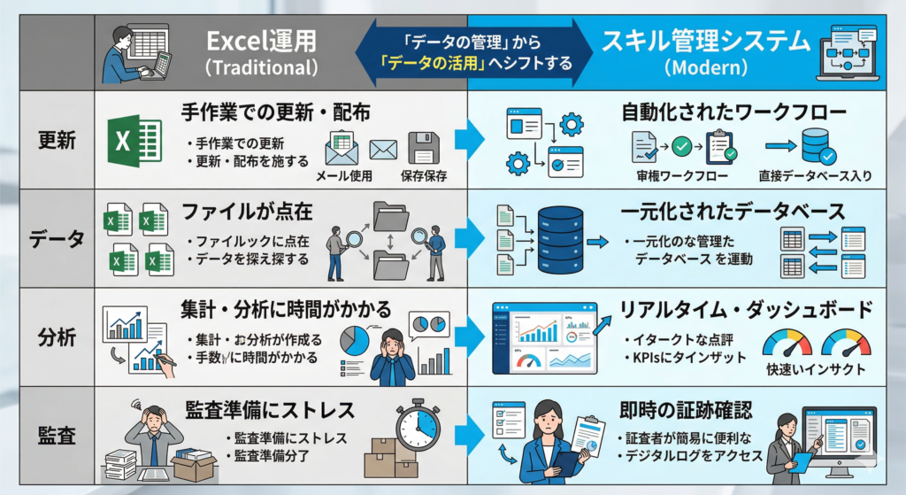 連動の不可能:スキルマップ・教育記録・資格台帳がそれぞれ別ファイルで存在する場合、整合性を維持するために多大な手間がかかります。「スキルレベルが上がったのに教育記録が紐づいていない」という状態が常態化します。