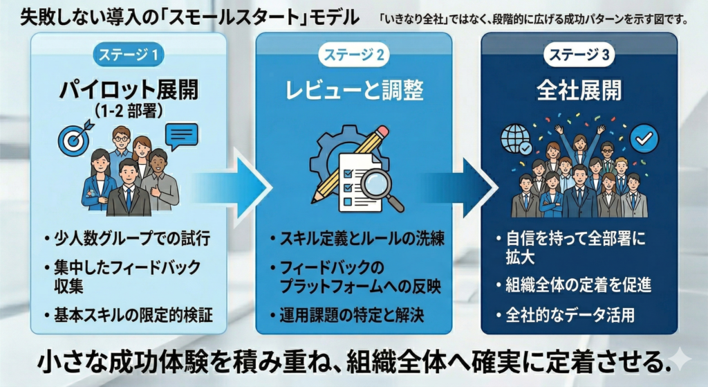 パイロット部門での成功体験をもとに全社展開します。評価結果を育成計画・配置・面談に実際に活用することで「使う意味がある」という従業員の実感を作り、運用の継続につなげます。