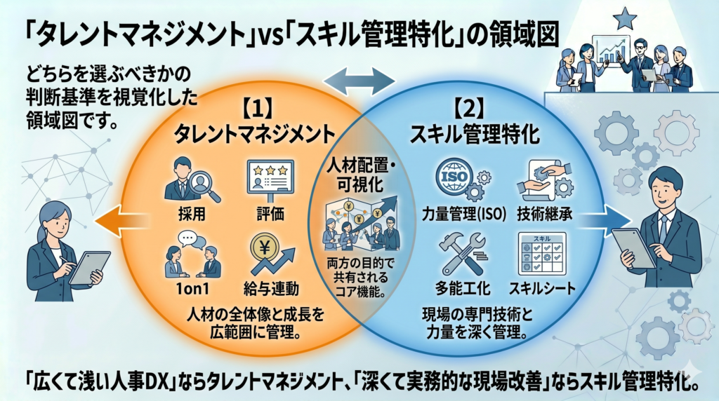 ここで注意したいのは、2026年時点でタレントマネジメント製品もスキル管理機能を強化してきているものの、製造業の「多能工管理」や「設備別の作業可否」「ISO9001の力量証跡管理」といった現場要件には依然として表現力が不足しがちな点です。汎用タレントマネジメント製品は全社的な「人材配置」には向きますが、現場の「力量管理(ISO対応)」では機能が薄く、カスタマイズコストが膨らむ場面が少なくありません。スキル管理に深く踏み込みたい場合は専用システム、人事業務全般を統合したい場合はタレントマネジメント、というのが大まかな使い分けです。詳細はスキル管理システムの選び方・導入手順で整理しています。